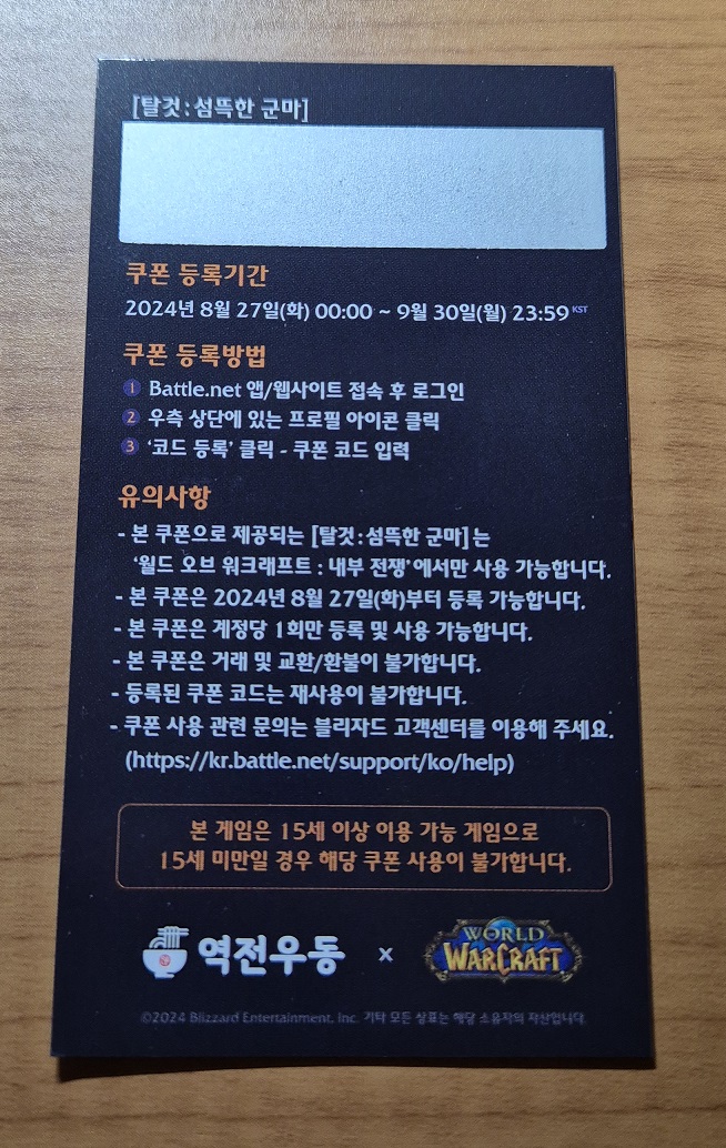 월드오브워크래프트 : 내부전쟁 출시기념으로 와우X역전우동 컬래버레이션을 진행해서 구매를 해봤습니다.