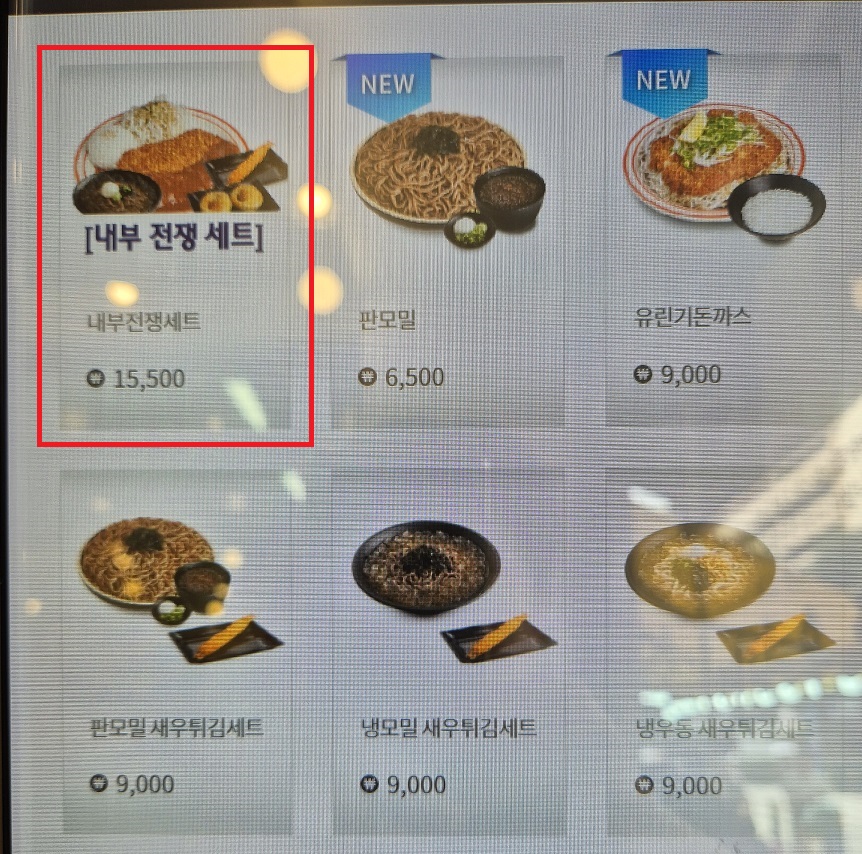 [내부 전쟁 세트]의 구성은 돈까스 모밀세트 + 새우튀김 + 왕만두튀김입니다.