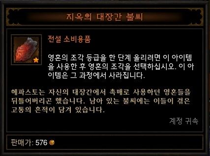 영혼의 조각 업그레이드에 사용되는 지옥의 대장간 불씨 사진입니다.