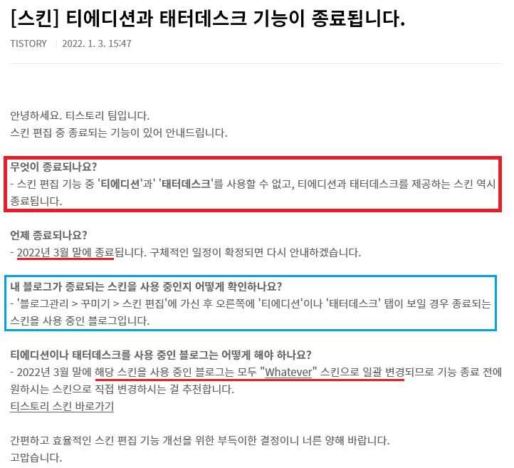 2022년 1월 3일에 간편하고 효율적인 스킨 편집 기능 개선을 위해서 부득이하게 2022년 3월 말에 '티 에디션'과 '태터 데스크' 서비스와 해당 기능을 사용하는 구형 스킨이 종료된다는 공지가 올라왔습니다.