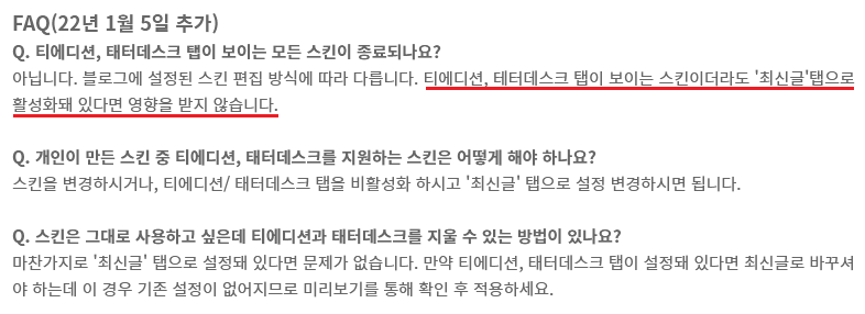 대비 방법으로 스킨을 미리 변경하는 방법과 티 에디션, 태터 데스크 탭이 아닌 최신 글 탭을 활성화하는 방법이 있다고 하니 편한 방법을 사용하면 될 거 같습니다.