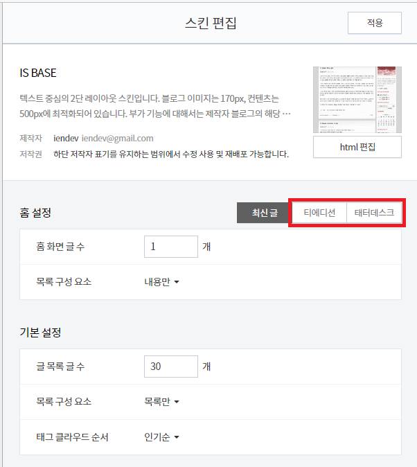 스킨 편집 우측의 스킨 편집 내용 중 '티에디션'이나 '태터데스크'가 활성화되어 있는지 확인합니다.